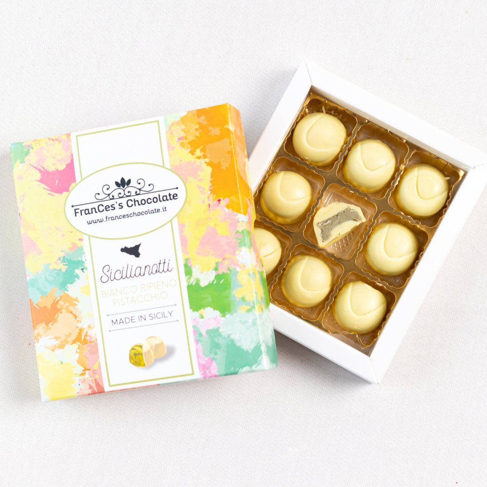 Cioccolato bianco , ripieno di crema artigianale al pistacchio.