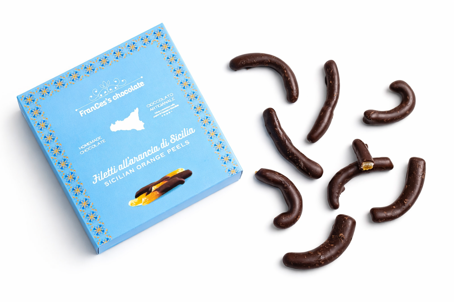Scorzette di arancia di Sicilia, ricoperte con cioccolato extra fondente.