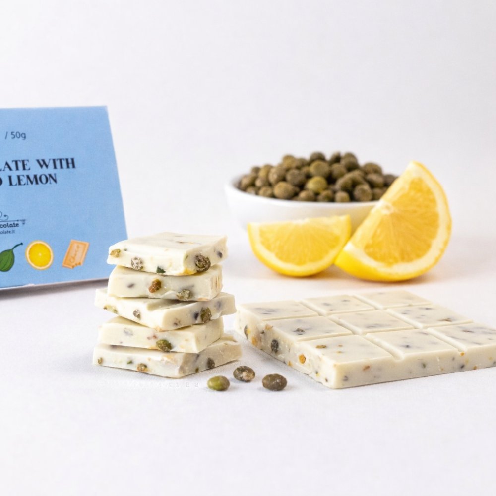 La nostra tavoletta gourmet con cioccolato bianco , capperi e limone, è una vera specialità!